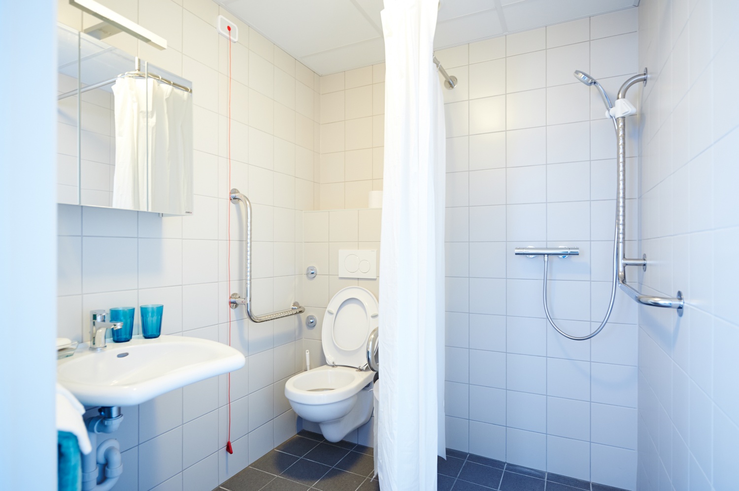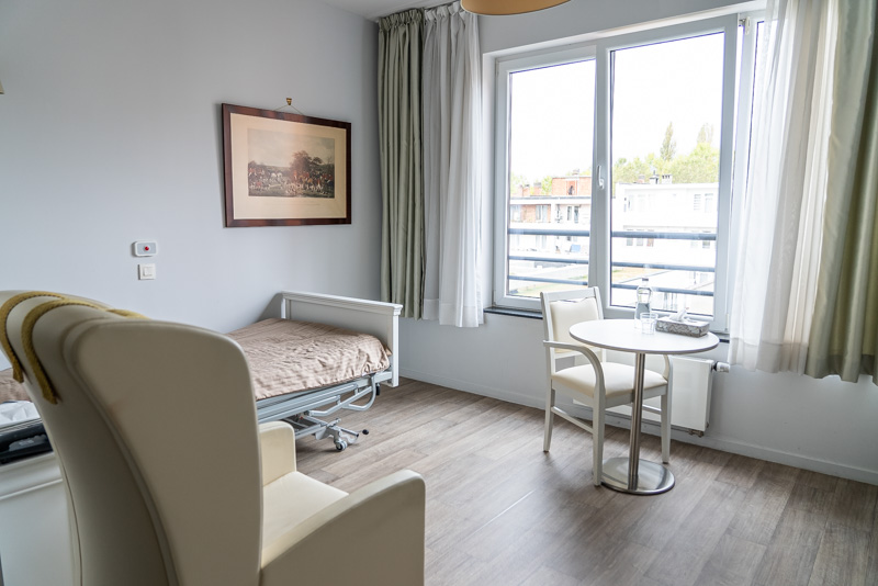 Een- en tweepersoonskamers uitgerust met telefoon, kledingkast, tafeltje, verpleegoproep op de kamer en badkamer